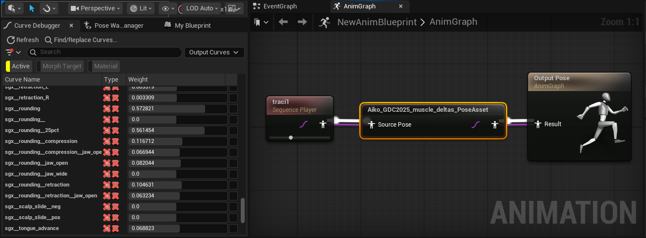 SGX Studioでは通常、アニメーションターゲットをキーイングすることでアニメーションをインポートしますが、SGX 4.5では、Unreal EngineのAnimation Pose Assetsをキーイングする代わりに、新たなインポートモードが追加されました。SGXでのマッスルの変位は、キーマッスルデルタ機能によってPose Assetsに変換されます。その後、新たなPose Weightsアニメーションインポートモードによって、ポーズに対するウェイトとしてSGX Eventsがインポートされます。これにより、アニメーション内での基盤となるポーズが可視化されることになります。
